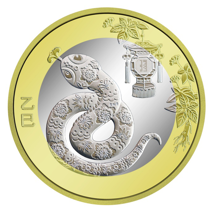 背面图案为中国传统剪纸艺术与装饰年画元素相结合的蛇形象,衬以花灯和人参图案,币面左侧刊“乙巳”字样。