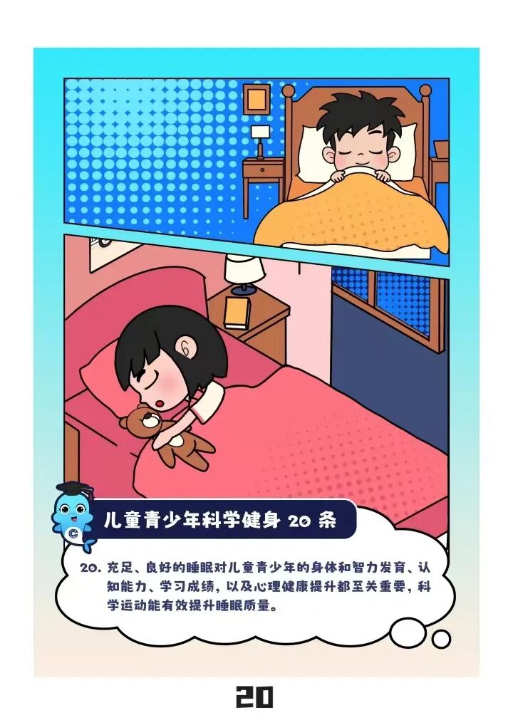 针对容易忽视的睡眠问题,“20条”着重强调了高质量睡眠对于儿童青少年生长发育的重要意义,然后从运动的角度指导儿童青少年可通过规律的有氧运动、拉伸运动等放松身心,促进睡眠,提高睡眠质量。