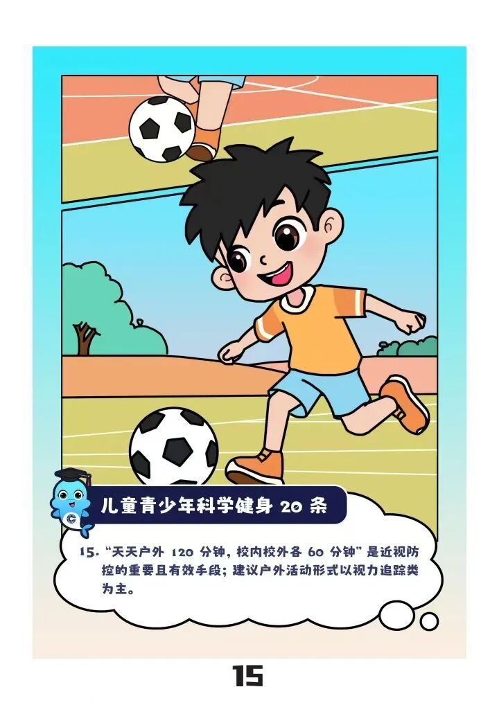 对于日渐重度化的近视问题,强调了户外活动对视力的保护作用,倡导“天天户外120分钟,校内校外各60分钟”,从活动内容上也提出了开展视力追踪类活动和球类运动的建议,便于广大家长与孩子理解和实施。