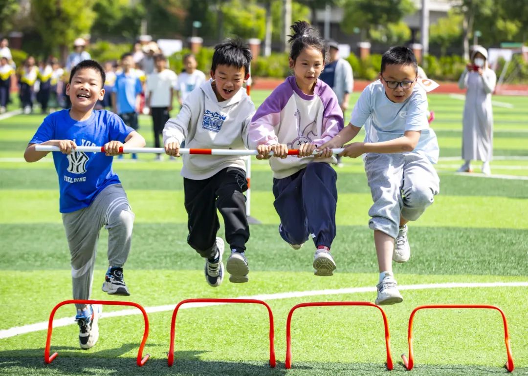 江苏省海安高新区实验小学举行“童享运动,燃趣校园”运动会,3000余名小学生在赛场上开展接力跑、跨栏、跳高等项目的角逐。中国教育报-中国教育新闻网通讯员 翟慧勇 摄