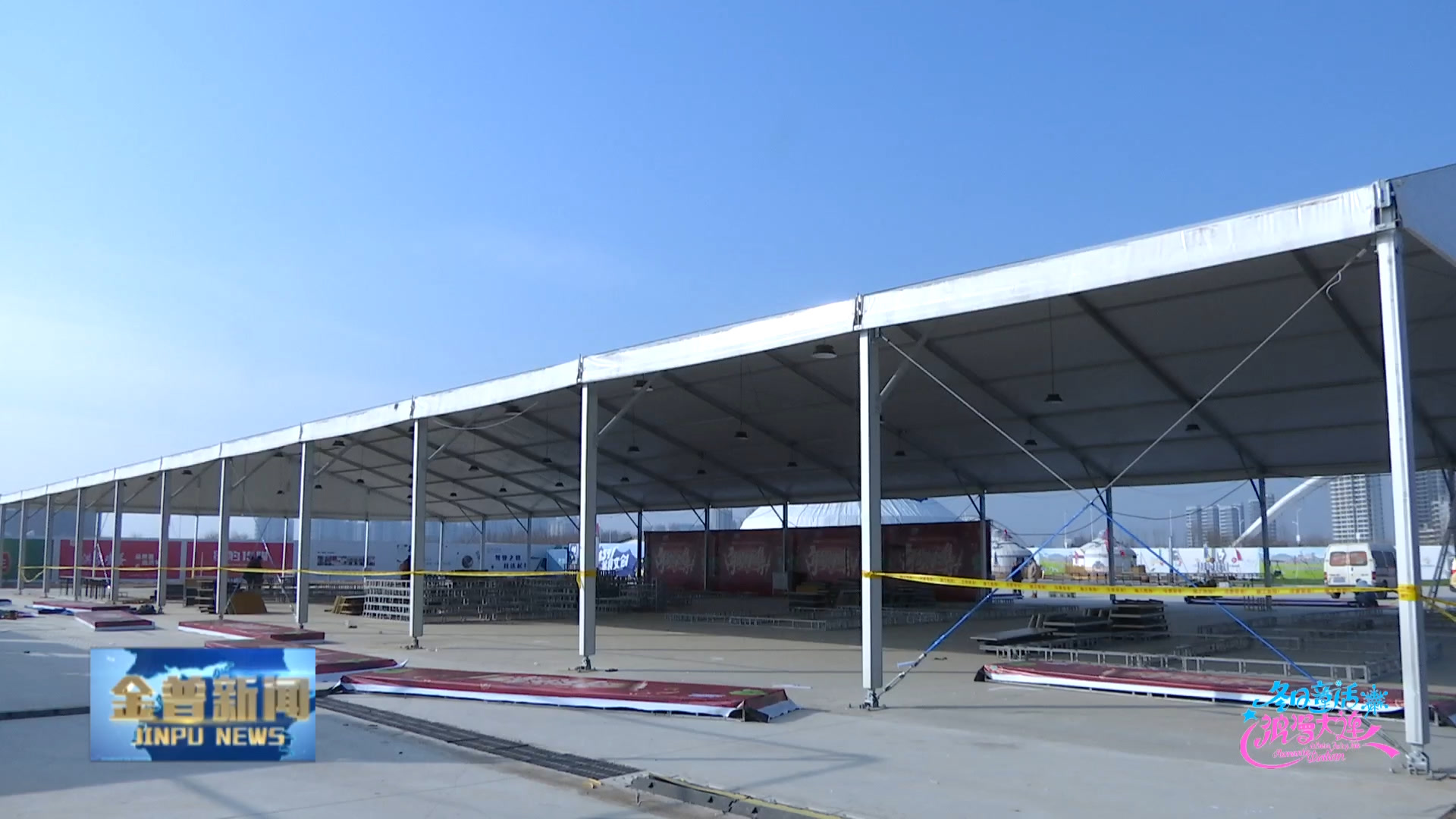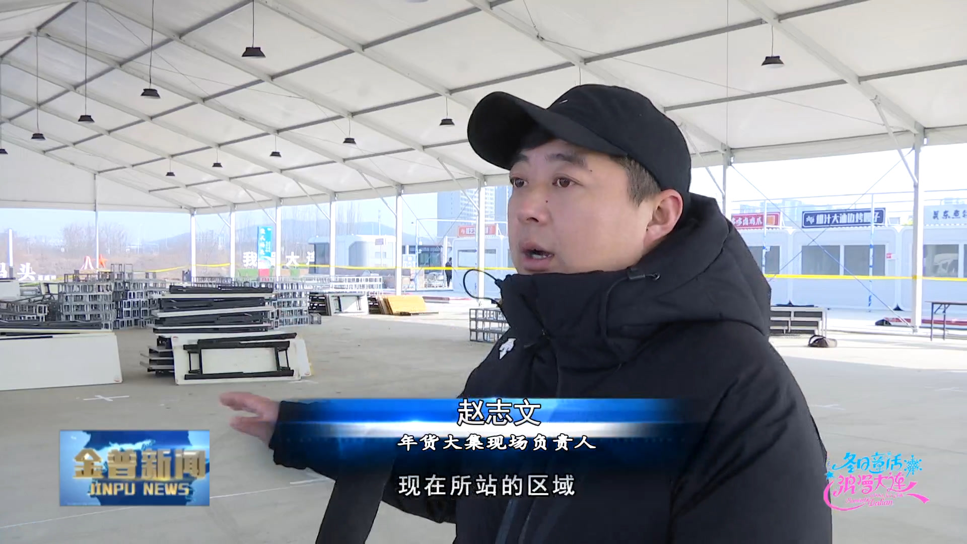 年货大集现场负责人赵志文(预计今天所有的现场搭建基本都要结束,现在所在的区域,就是这个大棚区,里面主要是以一些礼盒儿、水果儿,还有一些干果儿(为主),然后在舞台的侧方,是一些散户,当地的一些海鲜特色,这些散户在旁边有一些展位。)