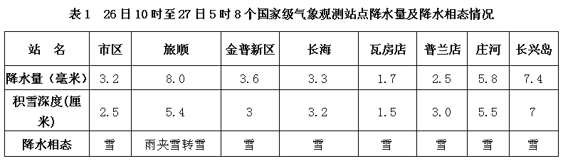 1月27日,大连市气象台发布海上大风橙色预警信号、大风黄色预警信号、大雪黄色预警信号。1月27日早晨至下午,全市有小雪,局部中雪,主要降水时段为1月27日早晨至上午。