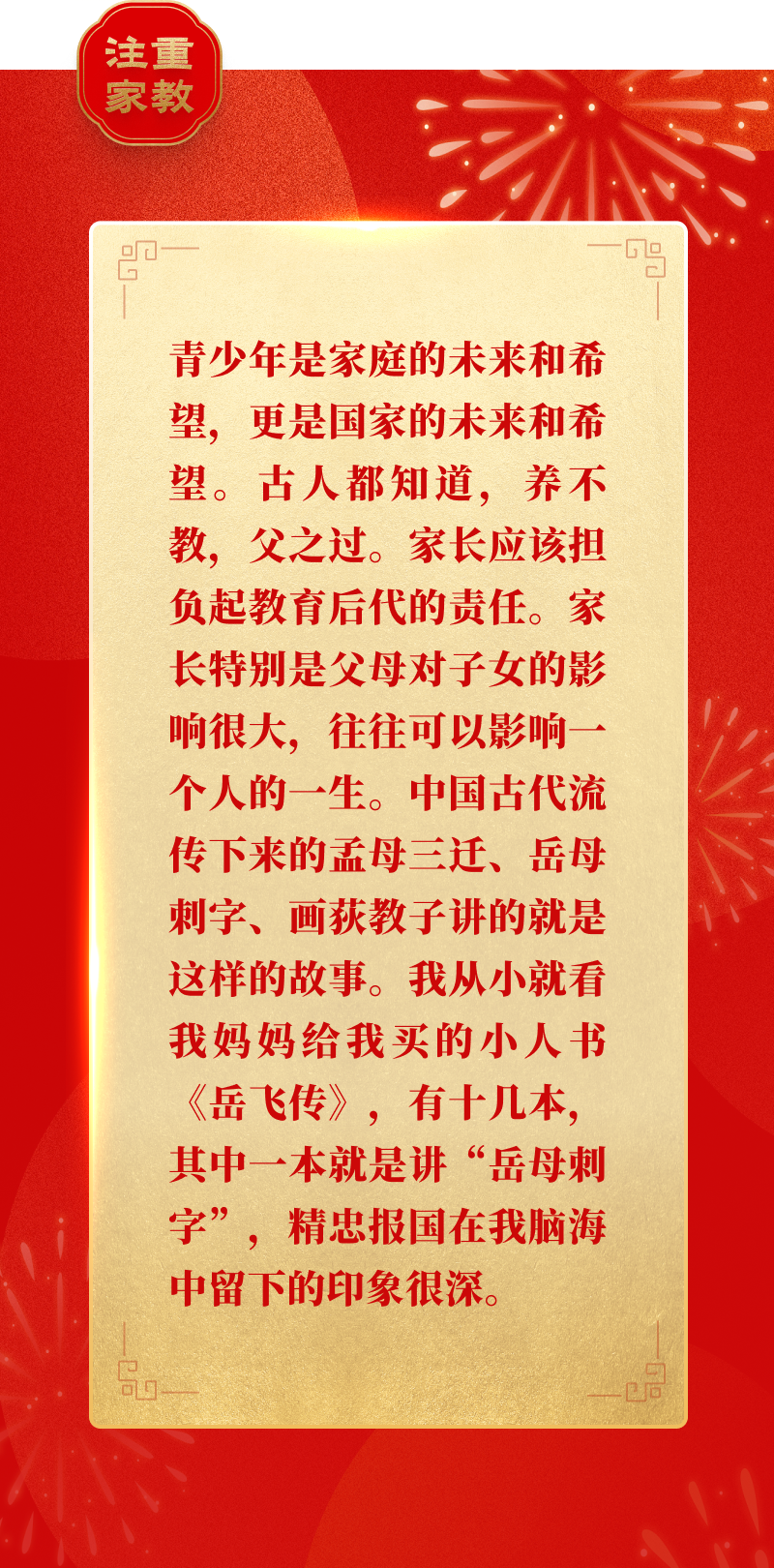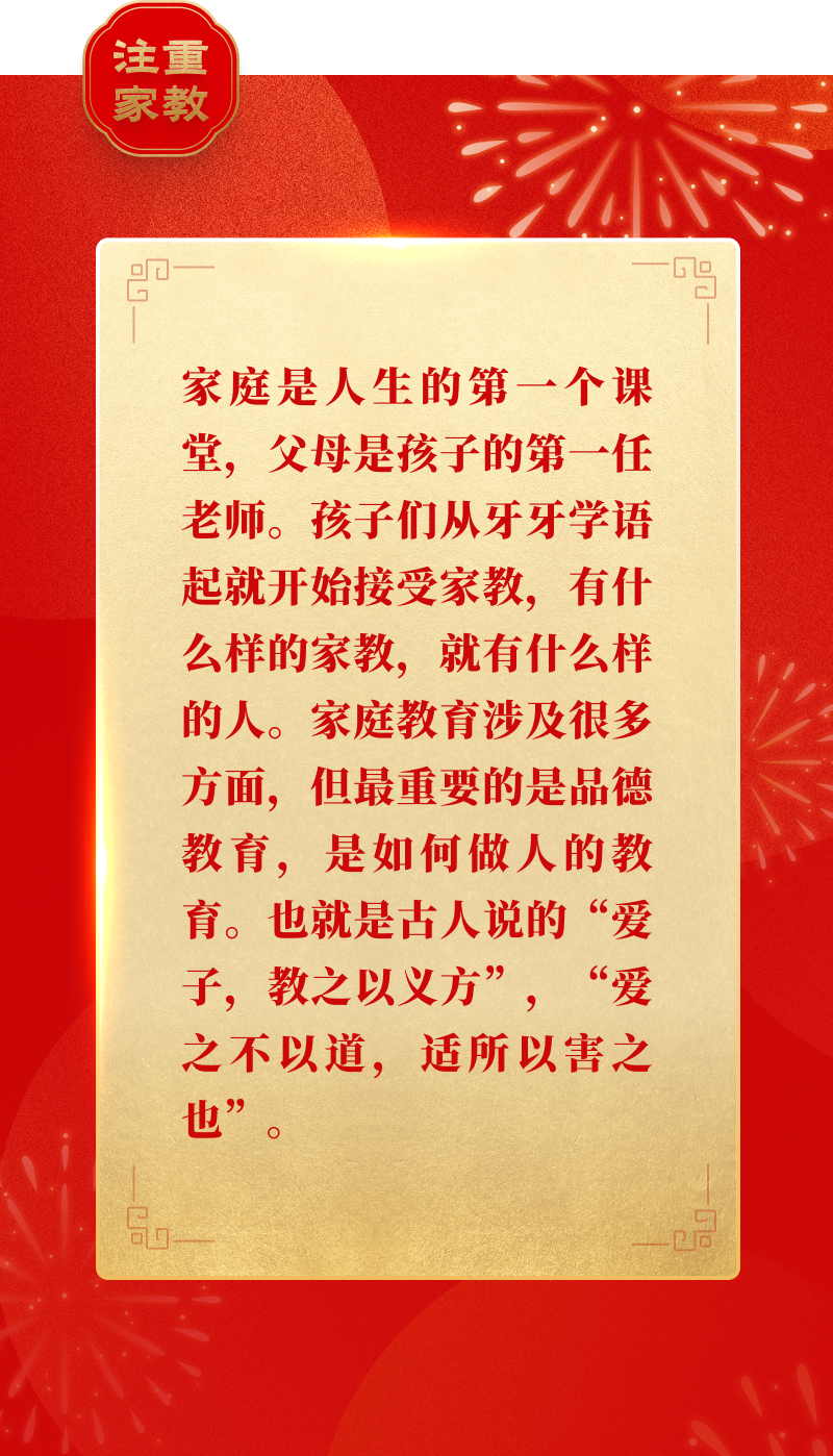 “家庭是人生的第一个课堂,父母是孩子的第一任老师。孩子们从牙牙学语起就开始接受家教,有什么样的家教,就有什么样的人。”
