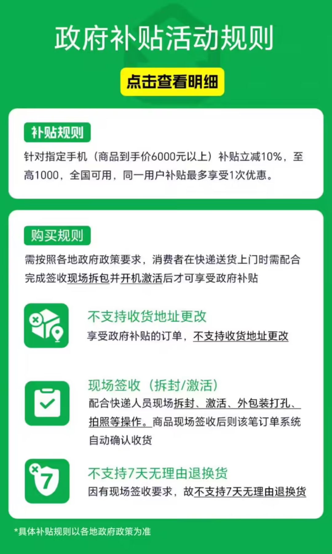 需按照各地政府政策要求,消费者在快递送货上门时需配合完成签收现场拆包并开机激活后才可享受政府补贴。