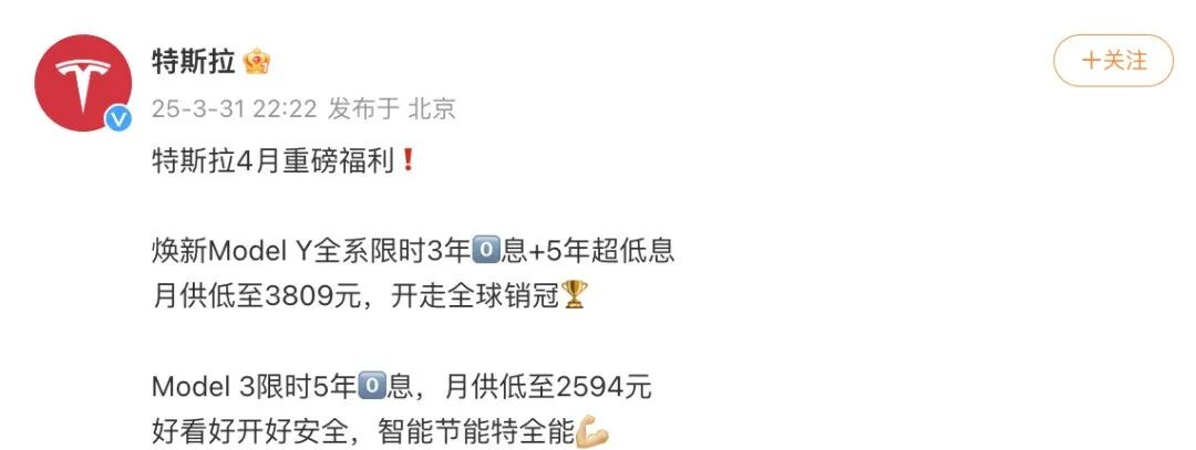 31日晚间,特斯拉中国宣布推出全新的限时购车政策:4月30日前,焕新Model Y首次全系推出限时3年0息和5年超低息购车金融政策,月供低至约3809元。另外4月30日前,Model 3后轮驱动版/长续航全轮驱动版推出限时5年0息政策,月供低至2594元。