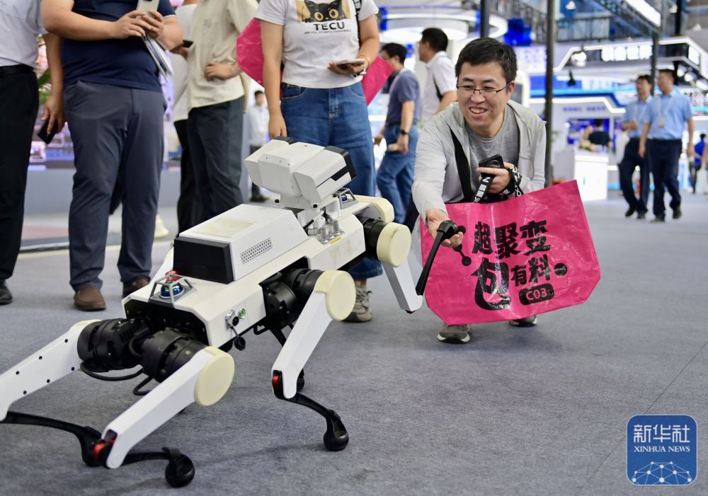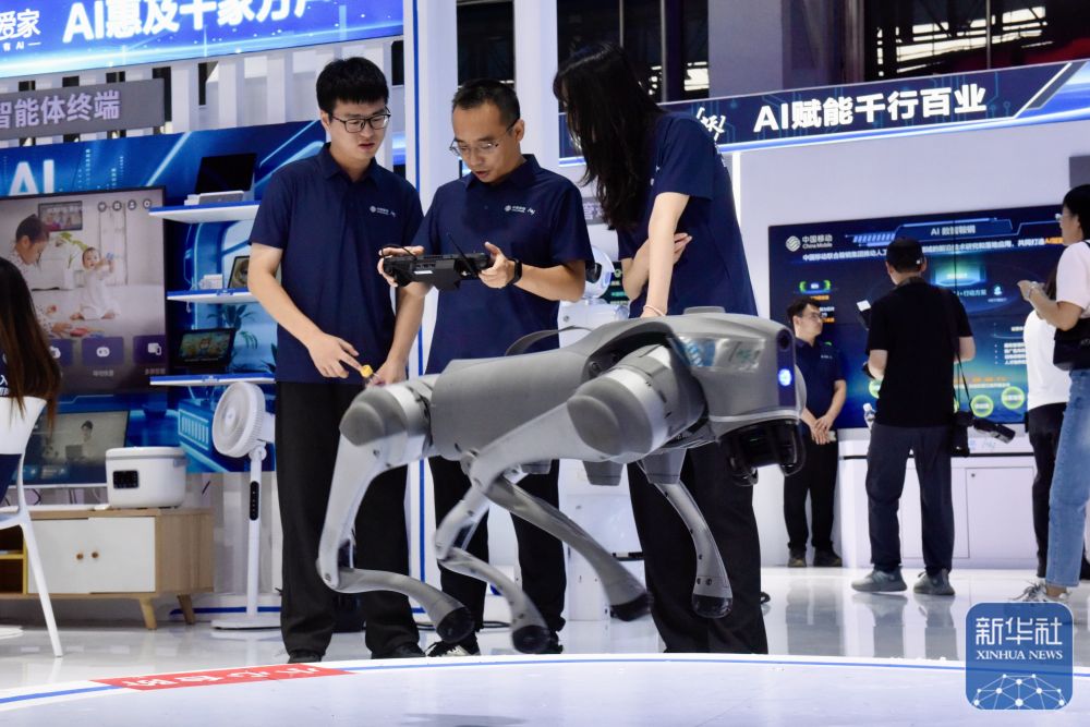 ↑ 9月7日,中国移动工作人员在调试机器狗。新华社发(王玉言 摄)