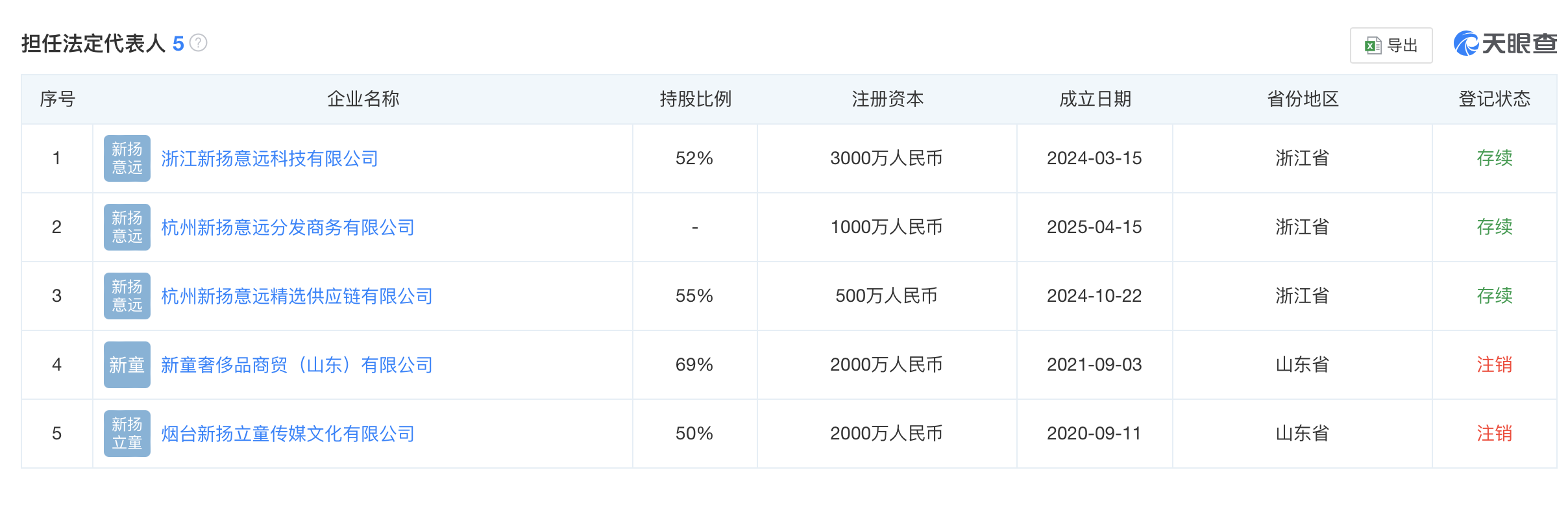 天眼查显示,孙悦童目前名下关联5家公司,均担任法定代表人。其中两家位于烟台,已经注销;三家位于杭州,仍是存续状态,注册资金分别为500万、1000万和3000万元。
