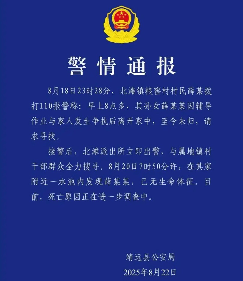 甘肃靖远县公安局在警情通报中还原了事件经过:8月18日23时28分,北滩镇粮窖村村民薛某拨打110报警称:早上8点多,其孙女薛某某因辅导作业与家人发生争执后离开家中,至今未归,请求寻找。接警后,北滩派出所立即出警,与属地镇村干部群众全力搜寻。8月20日7时50分许,在其家附近一水池内发现薛某某,已无生命体征。目前,死亡原因正在进一步调查中。