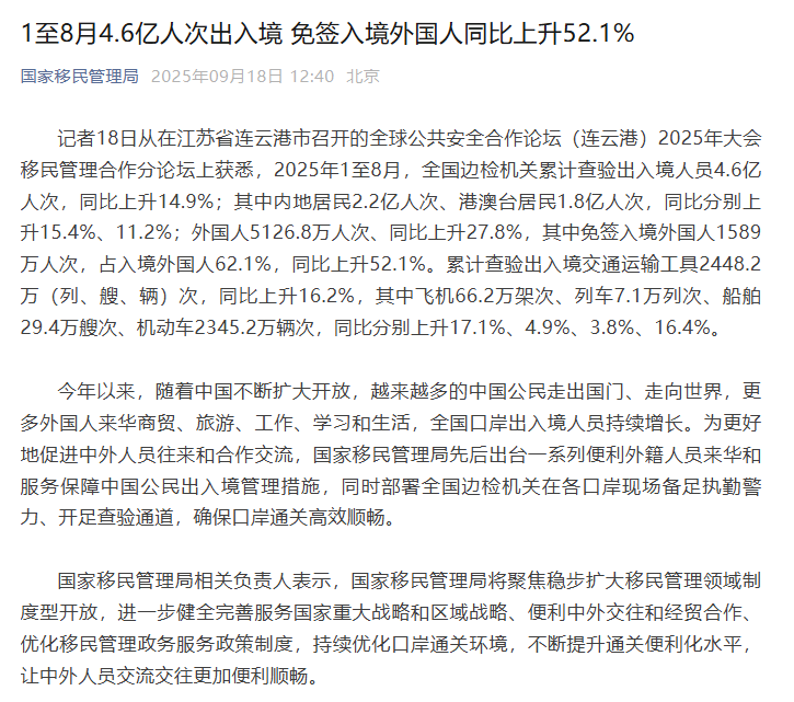 记者18日从在江苏省连云港市召开的全球公共安全合作论坛(连云港)2025年大会移民管理合作分论坛上获悉,2025年1至8月,全国边检机关累计查验出入境人员4.6亿人次,同比上升14.9%;其中内地居民2.2亿人次、港澳台居民1.8亿人次,同比分别上升15.4%、11.2%;外国人5126.8万人次、同比上升27.8%,其中免签入境外国人1589万人次,占入境外国人62.1%,同比上升52.1%。累计查验出入境交通运输工具2448.2万(列、艘、辆)次,同比上升16.2%,其中飞机66.2万架次、列车7.1万列次、船舶29.4万艘次、机动车2345.2万辆次,同比分别上升17.1%、4.9%、3.8%、16.4%。