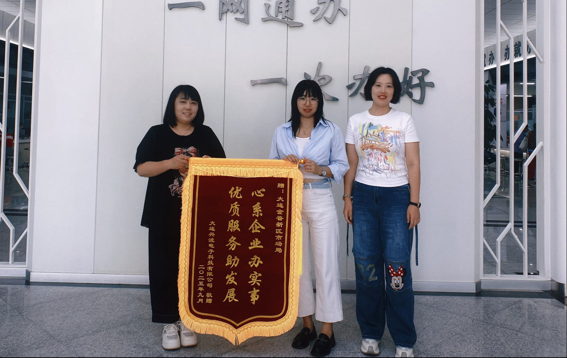近日,大连兴波电子科技有限公司负责人专程来到市场局,将一面写有“心系企业办实事 优质服务助发展”的锦旗送到工作人员手中,对新区市场监督管理局在企业设立过程中提供的精准指导和优质服务表示衷心感谢。