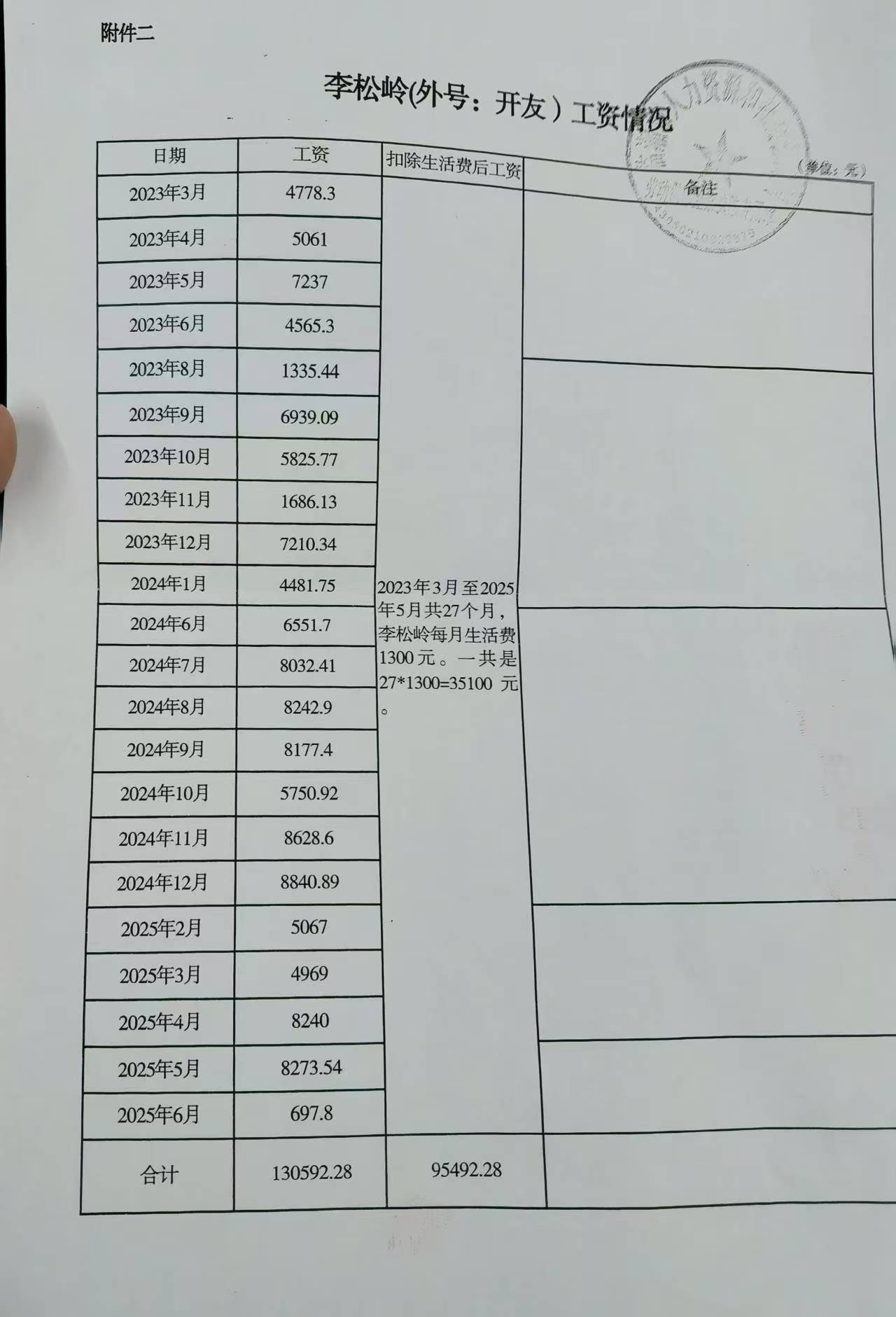临湘市人社局出具的李松岭的工资核算表显示,2023年3月至2025年6月4日,李松岭每个月的工资,从1335元到8840元不等,共计为130592元。