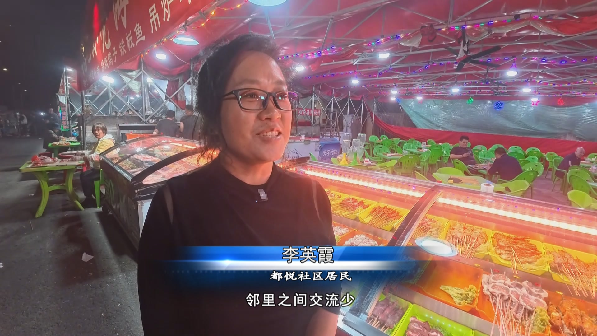 都悦社区居民李英霞(以前住老小区,邻里之间交流少,现在借着夜市的烟火气,大家走得更近了,感觉社区更热闹、更有人情味了。)