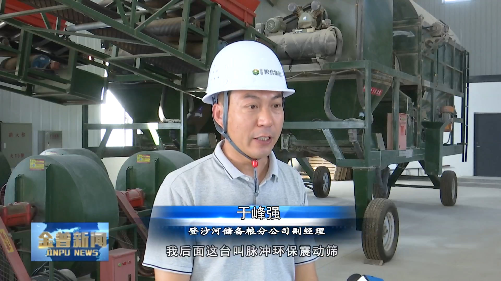 登沙河储备粮分公司副经理于峰强(我后面这台叫脉冲环保震动筛,它是通过高频的震动,使粮食和杂质有效进行分离,从而保证粮食的质量,达到国家标准。这样的作业量能超过以往人工的10倍以上,它的产量可以达到每小时80到100吨左右。)