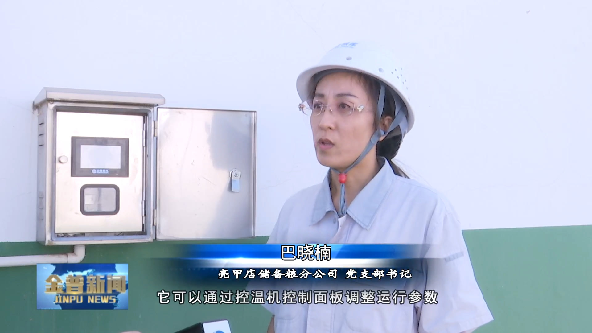 亮甲店储备粮分公司党支部书记巴晓楠(这是我们的仓储专用控温机,它可以通过控温机控制面板调整运行参数。温度高的时候自动工作,可以输出冷风,保证库房温度维持在20℃以下,为绿色储粮提供稳定环境。)