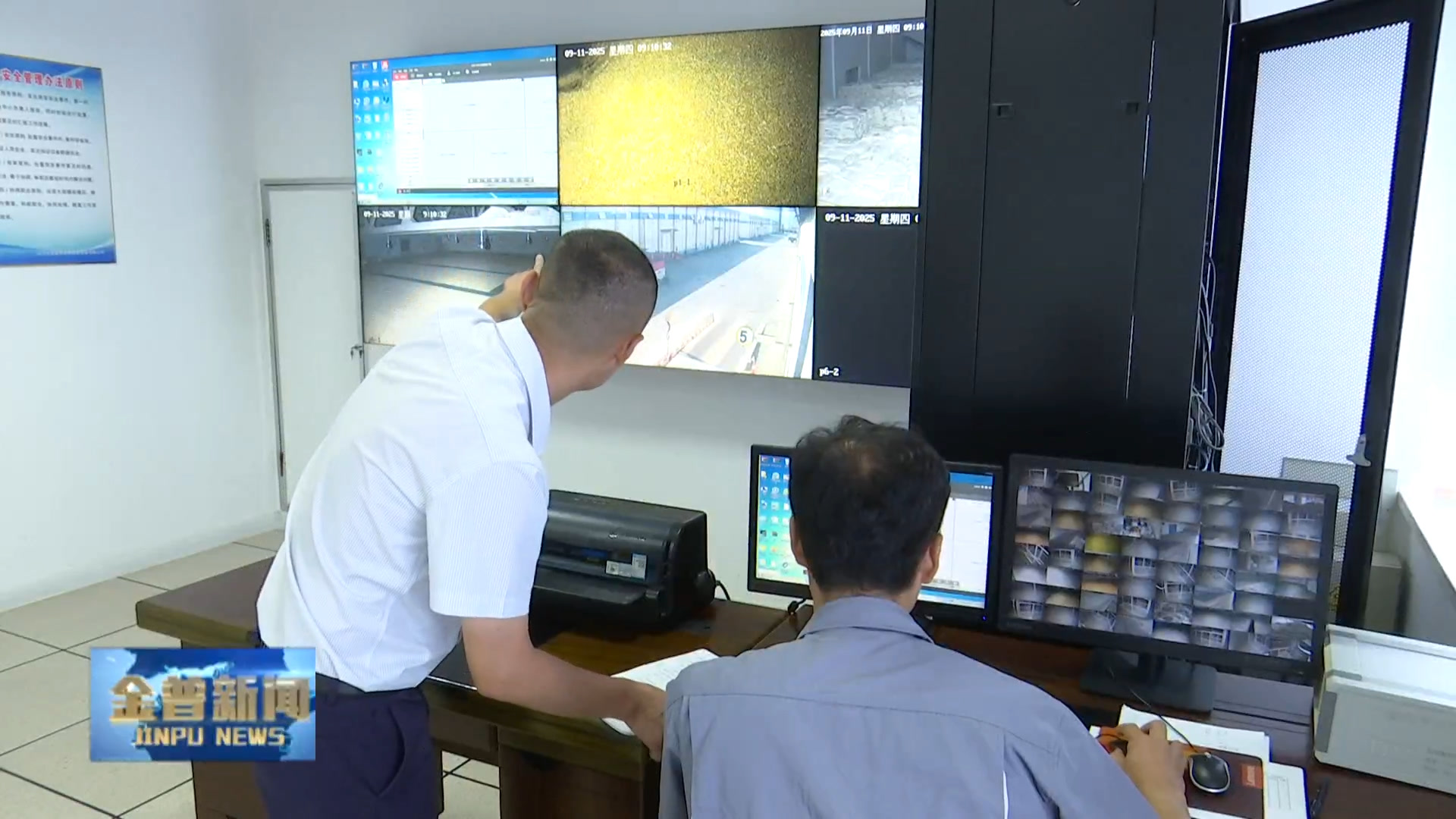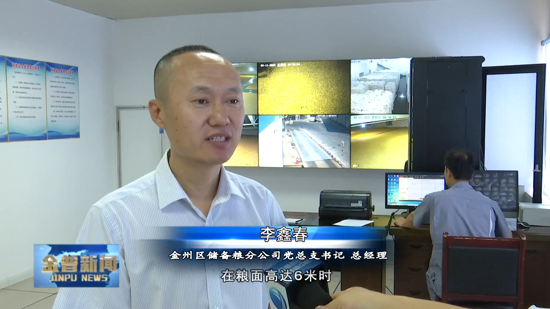 金州区储备粮分公司党总支书记、总经理李鑫春(我们仓内利用准低温的方式控温,在粮面高达6米时,原来的工作方式利用人工通过温度计测温很难达到预期效果,现在通过电子检温系统对粮食的上中下三层实时监控,确保粮食安全储藏。)