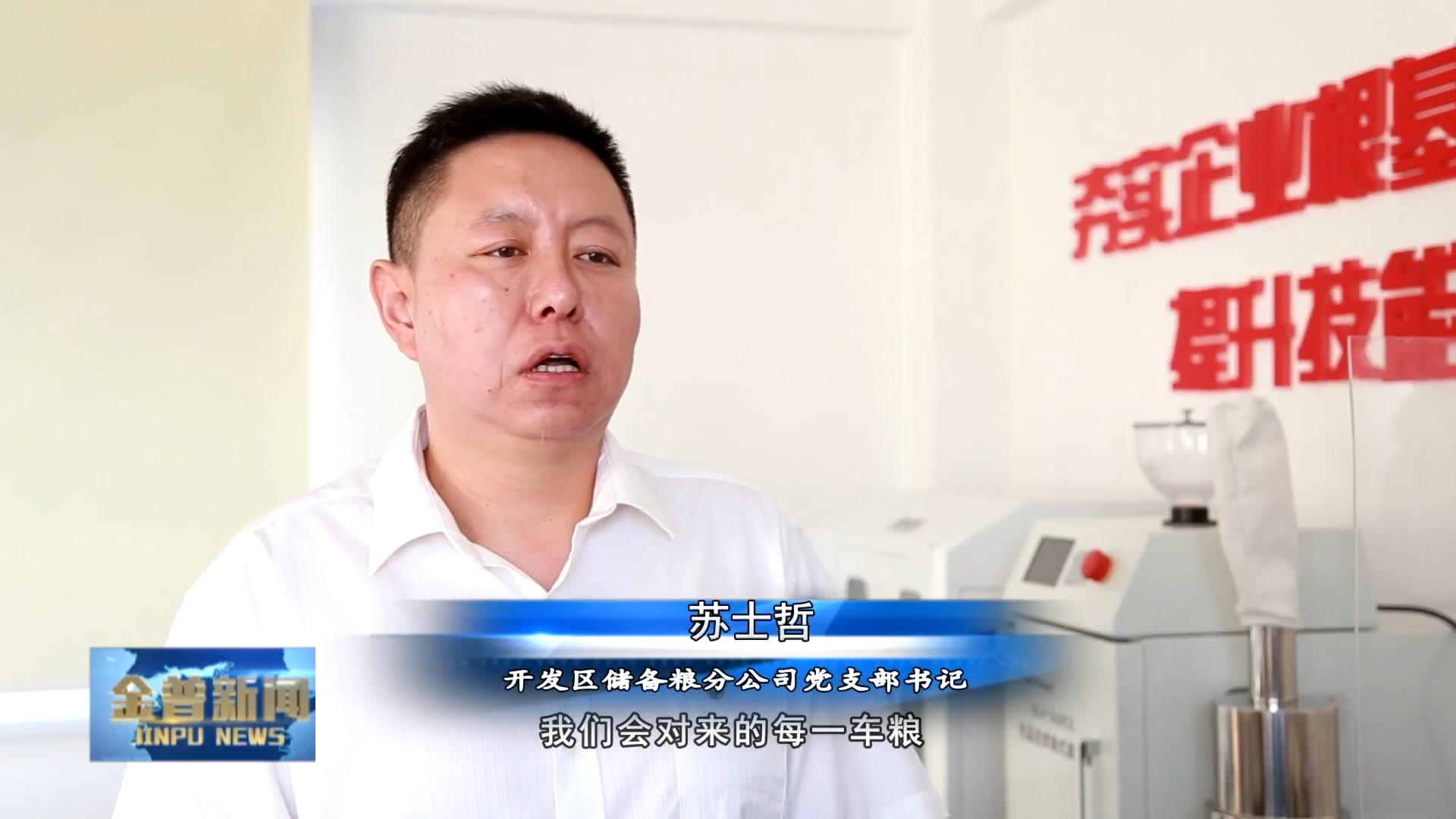 开发区储备粮分公司党支部书记苏士哲(我们会对来的每一车粮,利用自动扦样机抽取样子(品)送到化验室来进行样品分析,水分、容重、质量、杂质,还有卫生指标进行逐一分析,分析检验达到国家标准才可以入仓保管,确保国家粮食质量安全。)