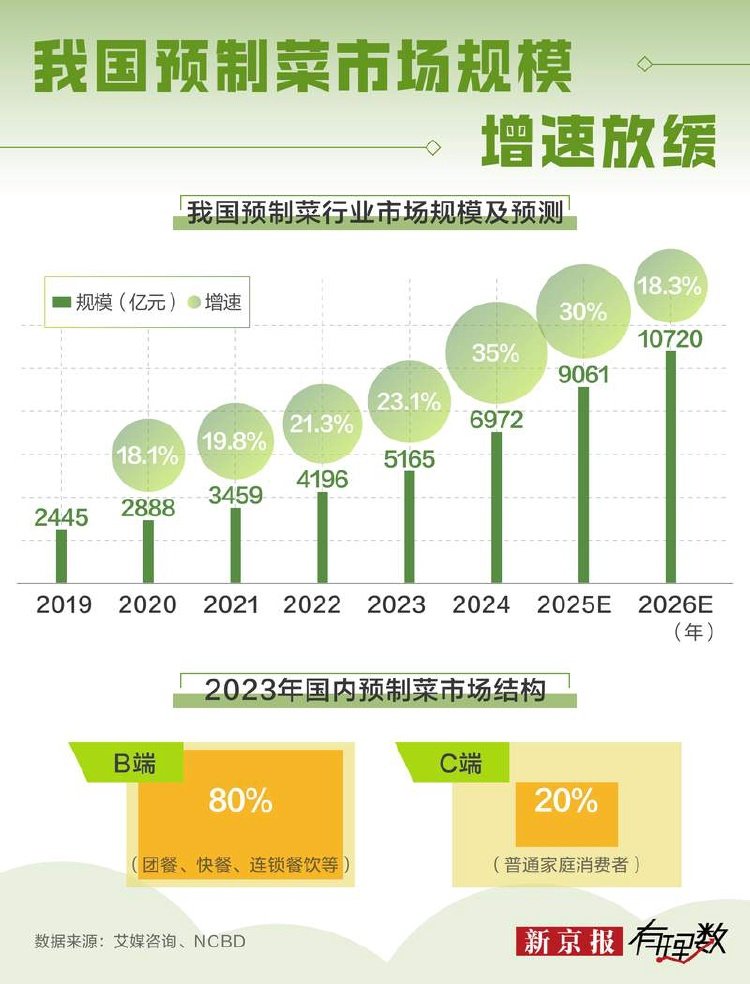 但热闹的背后,预制菜的增长脚步变慢了。行业数据显示,我国预制菜市场规模逐年扩张,并有望在2026年突破10720亿元。但从增速看,2024年预制菜市场增速达到35%,预计在2026年跌至18.3%。目前,国内的预制菜行业主要市场是团餐、连锁餐饮等B端企业,普通消费者的家庭消费中,预制菜仍是小比例。