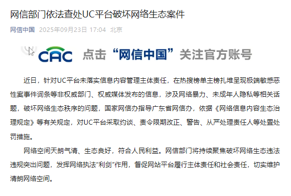 近日,针对UC平台未落实信息内容管理主体责任,在热搜榜单主榜扎堆呈现极端敏感恶性案事件词条等非权威部门、权威媒体发布的信息,涉及网络暴力、未成年人隐私等相关话题,破坏网络生态秩序的问题,国家网信办指导广东省网信办,依据《网络信息内容生态治理规定》等有关规定,对UC平台采取约谈、责令限期改正、警告、从严处理责任人等处置处罚措施。