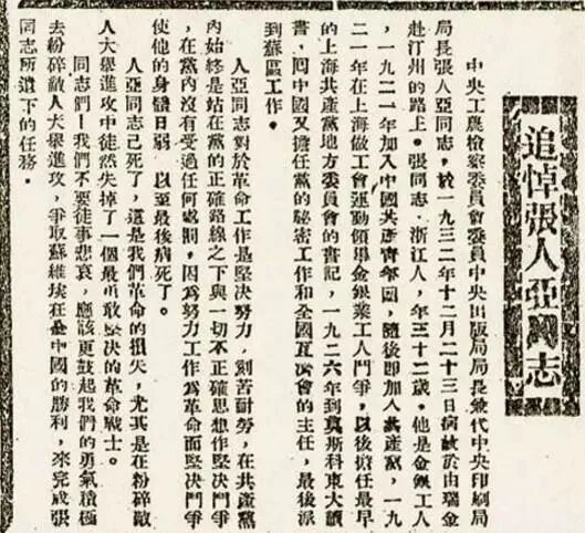 然而,长期的忘我工作使得他积劳成疾。1932年,张人亚病故于从瑞金去长汀检查工作的途中。