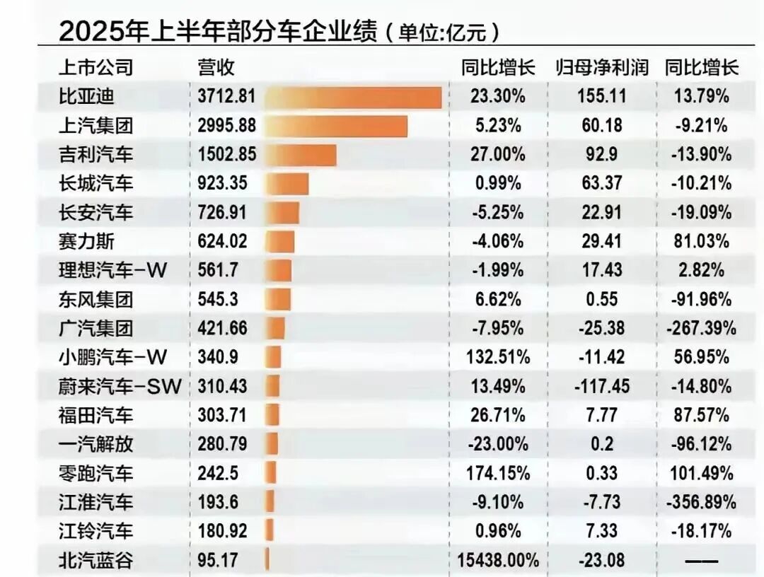 上半年车企成绩单呈现出一幅复杂的竞争图景。比亚迪作为行业“巨鲸”,不仅在营收和净利润上双双夺冠,更在向全年8000亿营收目标迈进。其成功绝非偶然,早在新能源汽车兴起之初,比亚迪便已布局全产业链,从电池到电控,从芯片到整车制造,形成了难以撼动的护城河。