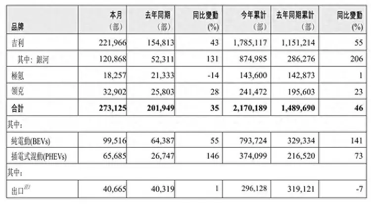 刚刚过去的这个9月是个大“金九”,不管是新势力,还是传统大厂,都有不错的成绩。比如吉利汽车,9月总销量27.31万辆,上涨35%,今年前9个月,吉利汽车累计销量217万辆,涨幅接近一半,为46%,这一数据也相当于自家2024年全年销量。