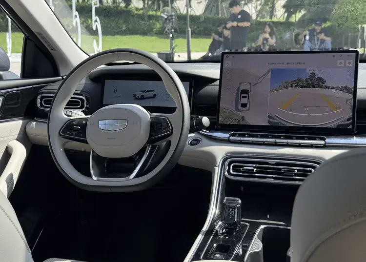 内饰方面,第5代帝豪采用三种内饰配色,配备14.6英寸悬浮式中控大屏和全液晶仪表,方向盘采用三辐平底式设计,搭配水晶材质换挡机构。