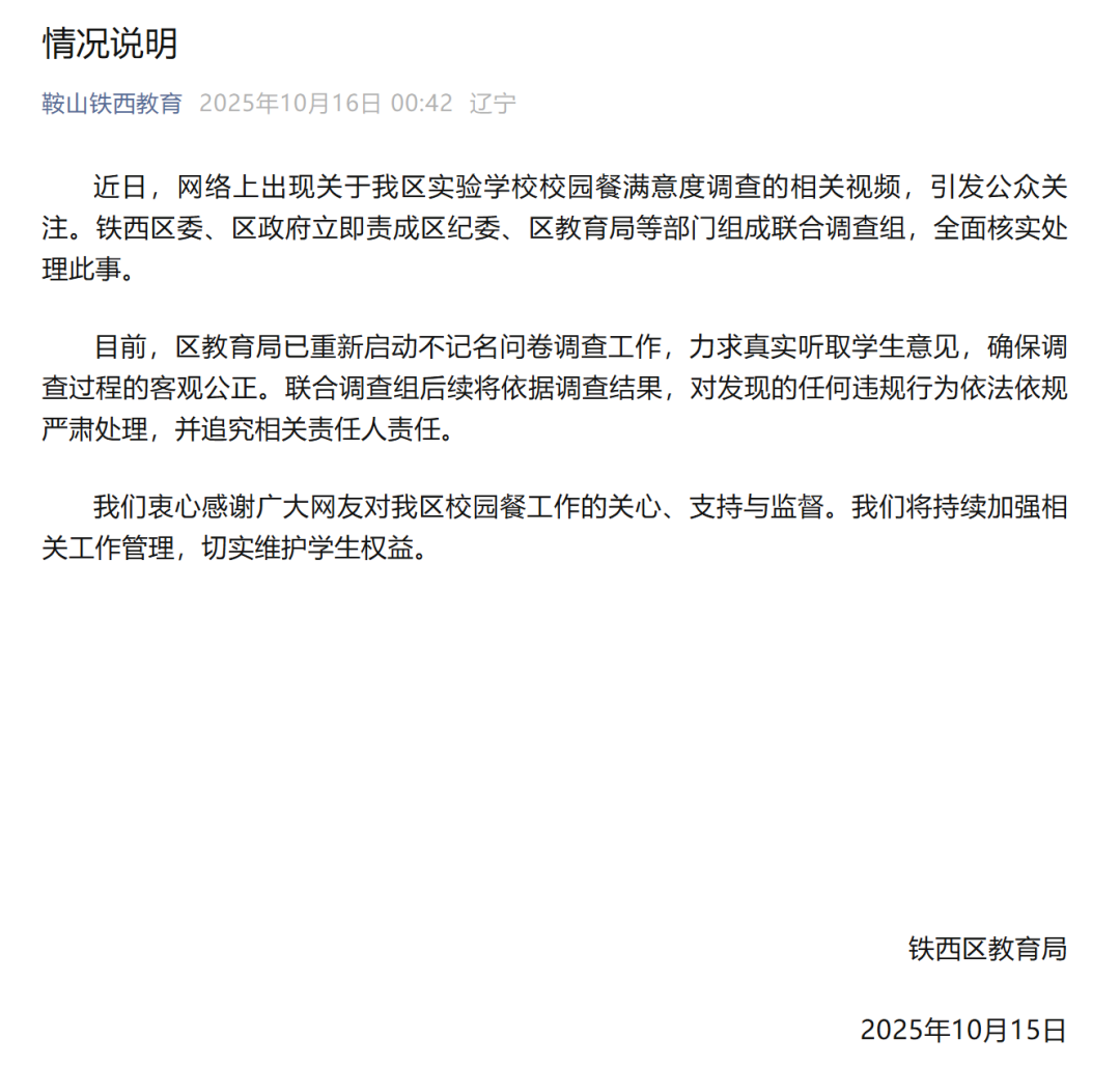 10月15日,铁西区教育局工作人员回应称,是学校个人行为,之前做的问卷全部作废,马上更改问卷重新调查,将对相关人员进行追责。10月16日凌晨,铁西区教育局发布情况通报:铁西区委、区政府立即责成区纪委、区教育局等部门组成联合调查组,全面核实处理此事。