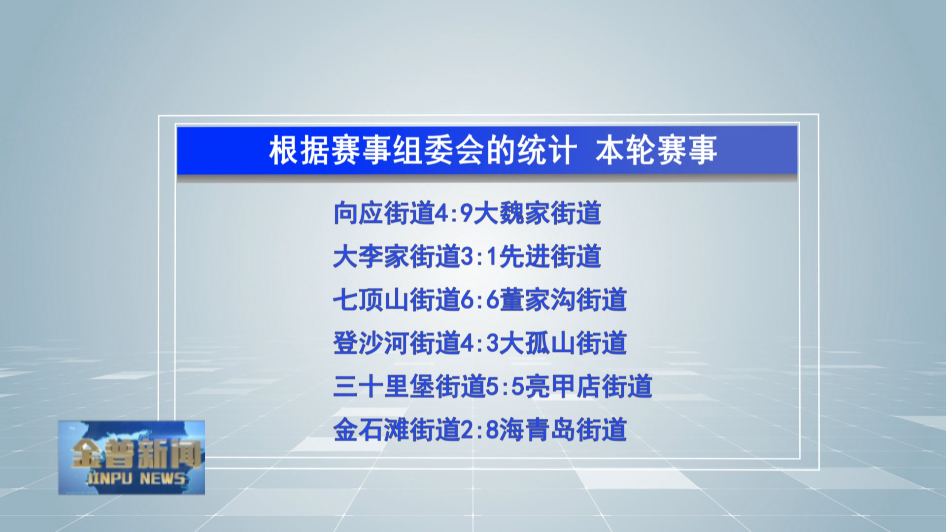 最终,向应街道4:9大魏家街道,大李家街道3:1先进街道,七顶山街道6:6董家沟街道,登沙河街道4:3大孤山街道,三十里堡街道5:5亮甲店街道,金石滩街道2:8海青岛街道,得胜街道1:4石河街道,站前街道1:2友谊街道,华家街道2:1马桥子街道,复州湾街道3:3杏树街道,二十里堡街道0:3光中街道,拥政街道6:5湾里街道。