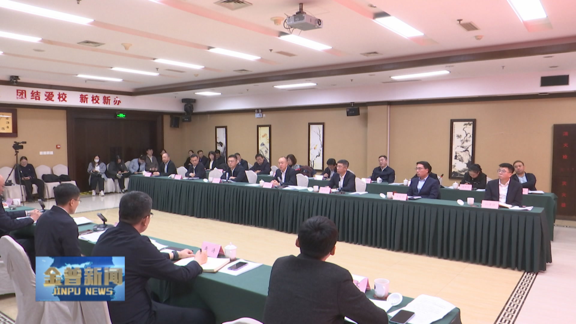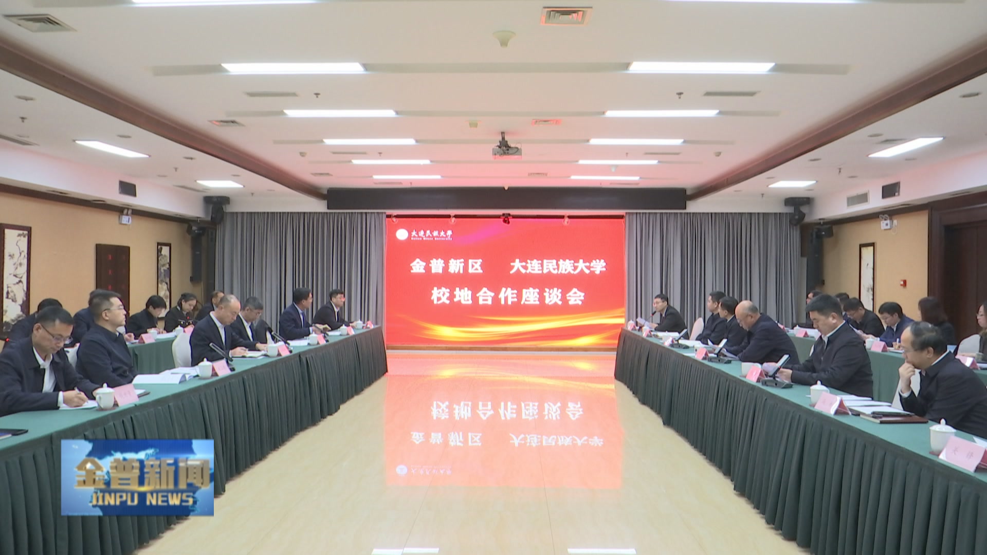 座谈会上,与会人员观看学校宣传片及“民大带你看大连”金普新区视频集锦。赵立涛介绍校地合作情况,新区领导就深化合作发言。