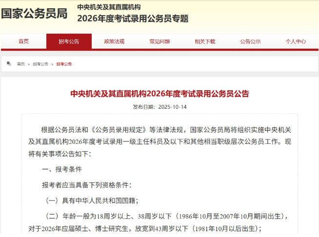 根据10月14日发布的2026年度国考公告,报考者的年龄上限提高到38岁,应届硕士、博士研究生放宽到43周岁以下。