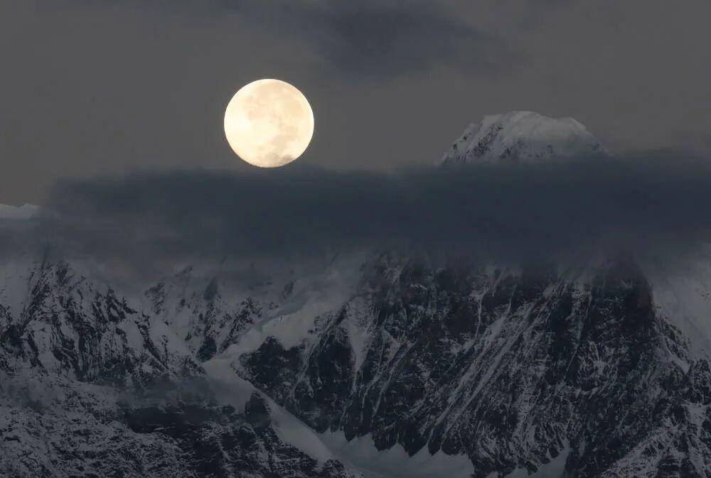 2024年10月17日,在云南迪庆藏族自治州梅里雪山拍摄的年度最大满月。(白