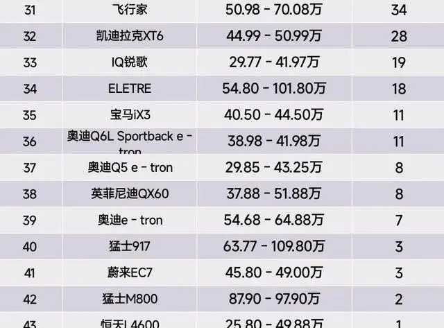 销量处于个位数十几或几十辆的车型揭示出另一类现象。仰望U8在第23位的67辆,说明超豪华或高定车型因目标客群有限,本就不以量取胜。阿维塔11、奔驰EQB与GLC新能源周销量在四十到五十台的区间,提示一些新能源细分市场的起步尚需时间,或者产品定位与渠道适配存在不足。发现神行、飞行家等传统或新进车型销量跌破三十辆,提示这些车型在当前周竞争环境中难以形成有效突破。对于厂商与经销商而言,存在可操作的方向:围绕用户关注点进行配置调整、延伸试驾与体验服务、优化金融与置换政策,这些具体措施能在短期内改善到店转化与成交效率。对消费者而言,榜单呈现的信息更直观:如果看重品牌与传统服务网点,奔驰或宝马系仍是直接选项;如果看重智能化、续航和补贴政策,问界与蔚来等新势力值得重点比较。