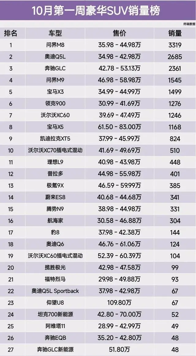 上周公布的10月第一周豪华SUV销量榜,给出了一个清晰的市场快照。榜单显示,问界M8稳居第一,问界M9位列第四,沃尔沃XC60排在第七,沃尔沃XC70插电混动登上第十,沃尔沃XC60插电混动排在第十九,福特烈马出现在第二十一名。奔驰GLC以2361辆的成绩占据第三名,紧随其后的是问界M9和宝马X3,后两者销量分别为1545辆和1499辆,进入前五行列。凯迪拉克XT5、普拉多、蔚来ES8的周销量都超过341辆,排名集中在前十四名之内。航海家、奥迪Q6、揽胜极光和福特烈马销量均超过93辆,从而挤入前二十五名。榜单后半段显示,仰望U8以67辆排在第23位,阿维塔11、奔驰EQB与奔驰GLC新能源的周销量在48到49辆之间。发现神行、飞行家、捷途纵横G700、IQ锐歌以及奥迪Q6L Sportback e-tron等车型的周销量低于30辆,状态相对平淡。