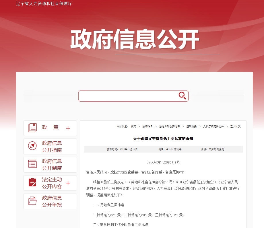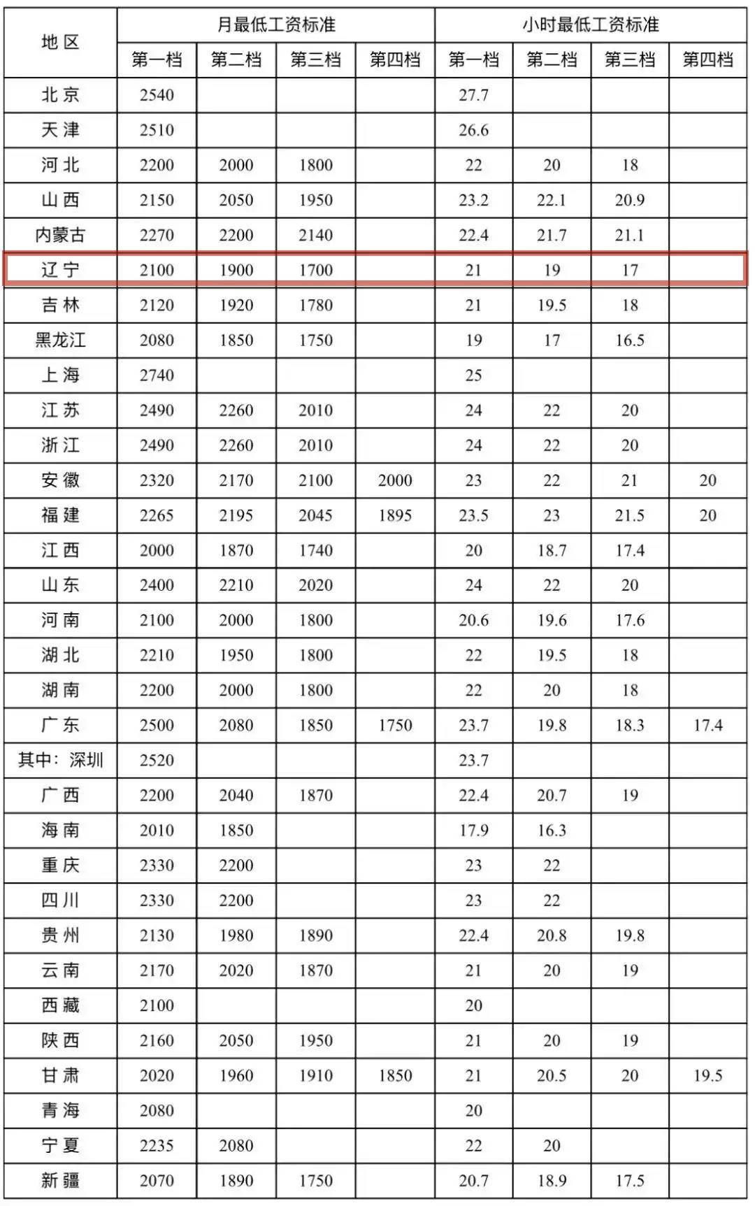 近日,经辽宁省人民政府同意、人力资源和社会保障部批准,辽宁省人力资源和社会保障厅印发《关于调整全省最低工资标准的通知》(辽人社发〔2025〕7号),明确自2025年12月1日起,全省将执行新的最低工资标准。
