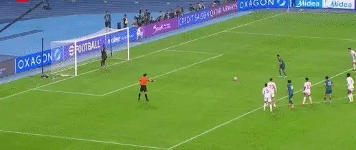 比赛读秒阶段,戏剧性一幕出现了。补时第15分钟,纳迪尔最后时刻手球送点,日本主裁判罚给伊拉克点球,阿马里点射命中,完成绝杀。最终,伊拉克两回合3-2淘汰阿联酋。