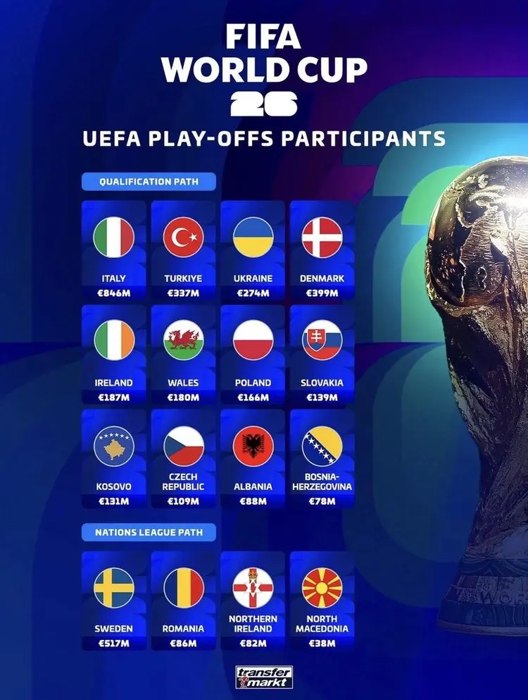 最受关注的无疑是意大利,他们连续三届参加附加赛,之前两届均折戟无缘世界杯,如今又要面临生死战,必须连赢2场才能出线。