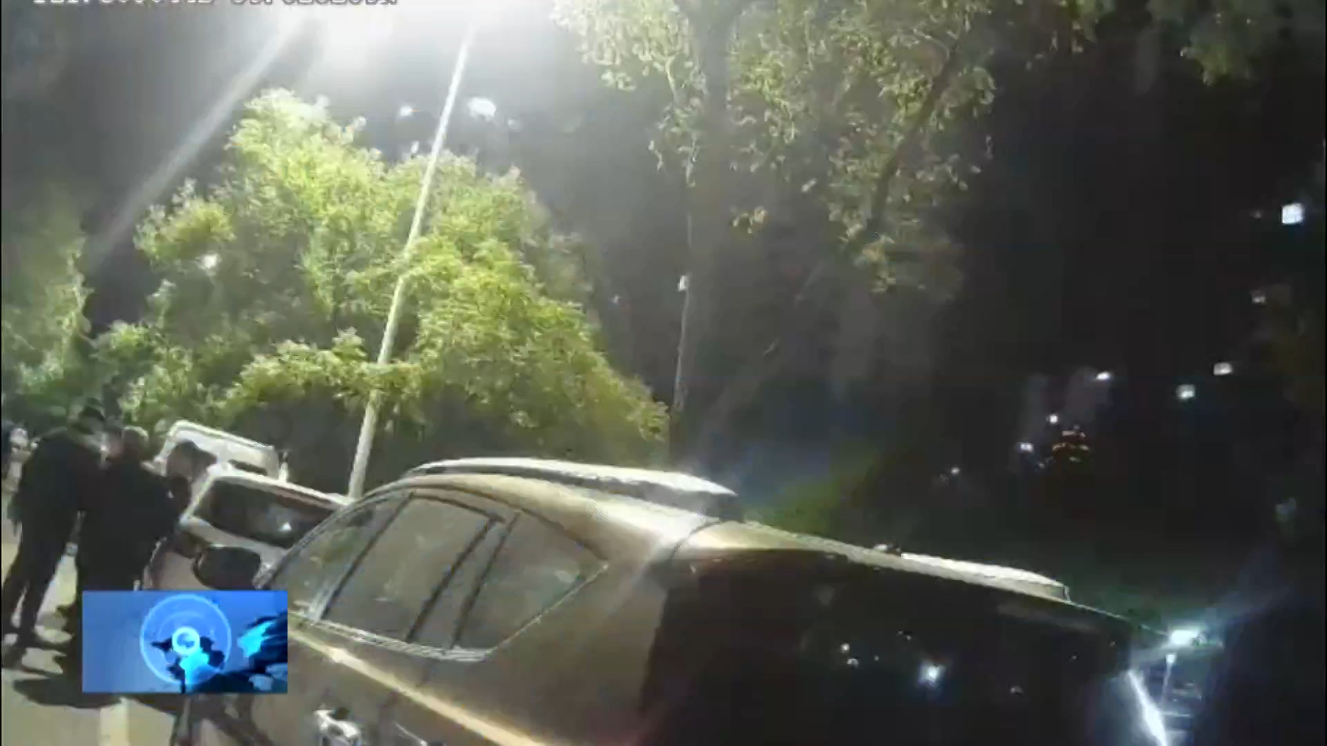 接警后,派出所巡警迅速赶到现场,此时嫌疑人仍然在踹打报案人后面的车辆。