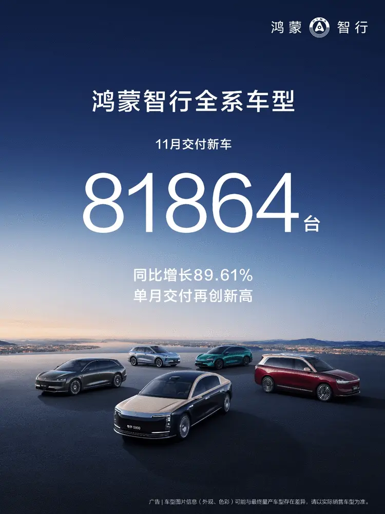 网易汽车12月1日报道,鸿蒙智行11月交付新车81864台,同比增长89.61%,得益于五界销量的攀升,鸿蒙智行本月再破新的交付记录。同时,受购置税退坡前的消费集中释放,再加上问界M7(参数丨图片)、M8,智界R7和新款享界S9的产品带动,12月的销量有望突破10万。