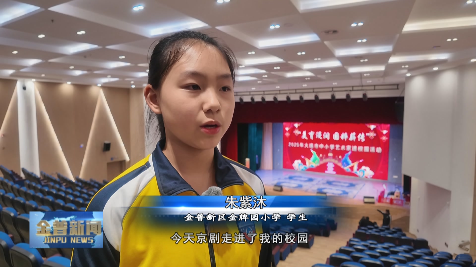 金普新区金牌园小学学生朱紫沐(今天京剧走进了我的校园,让我看到了一个非常精彩的节目,京剧里面有四大角色是,生、旦、净、丑这四个角色,今天的表演中我看到了,孙悟空大闹天宫这一个节目,我非常喜欢,今后我会更关注也会更了解京剧。)