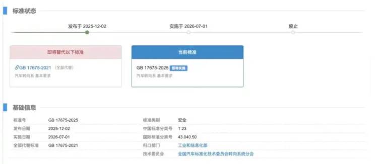 12月3日,工信部官网显示,标准号GB17675-2025《汽车转向系 基本要求》国家认证标准正式发布,新国标将从2026年7月1日起将全面取代此前的老标准,而这次新标准主要变化之一,就是引入了线控转向(SBW)、电动车助力转向(EPS)等专利。当然最核心的一点就是,删除了相关机械连接的强制、硬性要求,以后很多车辆都可以使用线控转向了。