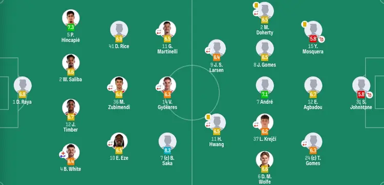 阿森纳首发:1-拉亚、4-本怀特(31'49-斯凯利)、2-萨利巴、5-因卡皮耶、12-廷贝尔、41-赖斯、36-苏比门迪(57'23-梅里诺)、10-埃泽(57'8-厄德高)、7-萨卡、11-马丁内利(57'19-特罗萨德)、14-哲凯赖什(81'9-热苏斯)