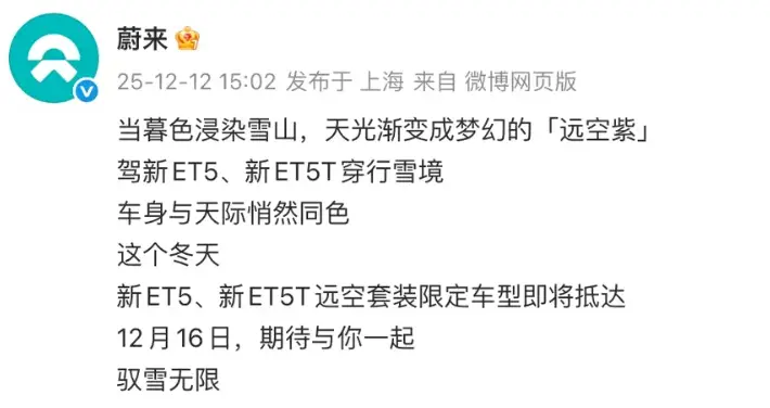12月12日,蔚来官方放出了一组图,ET5和ET5T的“远空紫”限定版,像把傍晚天空最梦幻的那一抹色彩,直接定格在了车身上。它不是什么简单的改色,而是一个带着专属印记的“远空套装”。最关键的是,它马上就要来了——官方宣布,12月16日,这款限定车型将正式亮相。对于正在观望ET5系列,又追求独特个性的朋友来说,这无疑是个令人心动的信号。
