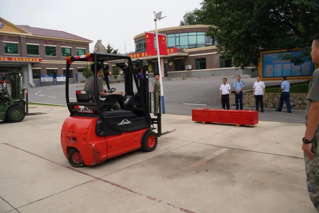 在军官讲解结束后,全体人员前往训练场地观摩叉车操作演示。根据指令,操作人员迅速就位,依次完成货物搬运、堆叠等基础项目,并展示了货叉启瓶盖、穿针眼等高精度项目。操作过程准确连贯,展现了扎实的操作技能与严格的训练标准,深刻展现了“精益求精、追求卓越” 的工作态度。