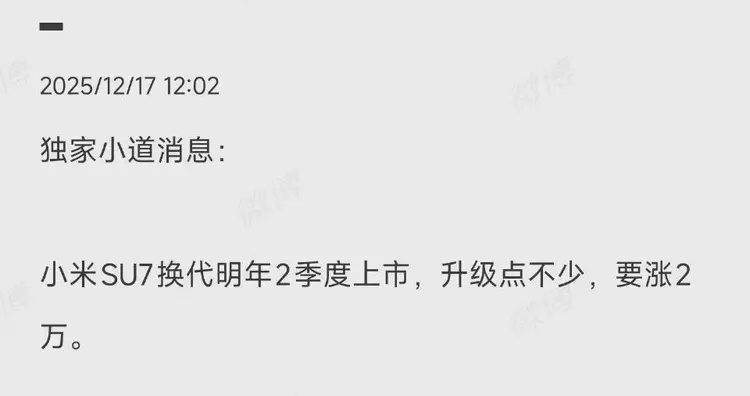 近日,有爆料称,小米SU7(参数丨图片)换代车型,预计2026年二季度上市,全系或涨价2万元。