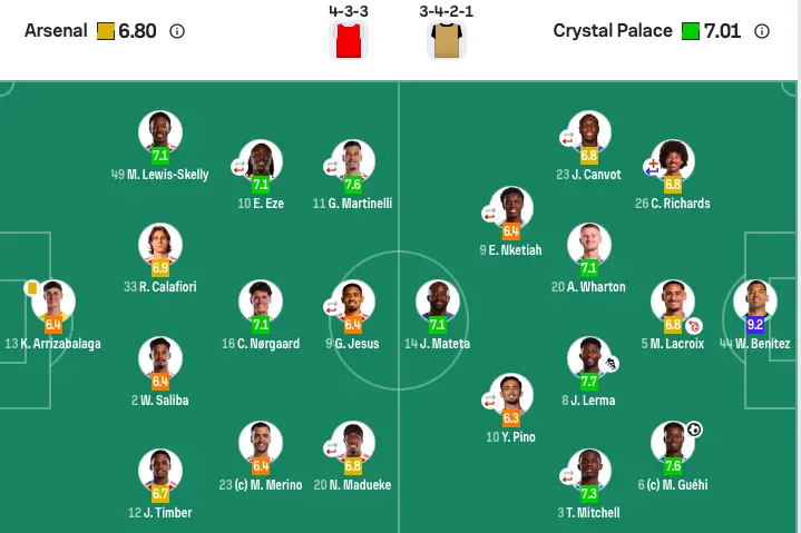 阿森纳首发:13-凯帕、12-廷伯、2-萨利巴、33-卡拉菲奥里、49-斯凯利、16-诺尔高、23-梅里诺、10-埃泽(67’8-厄德高)、20-马杜埃凯(67’7-萨卡)、11-马丁内利(59’19-特罗萨德)、9-热苏斯(86’41-赖斯)。