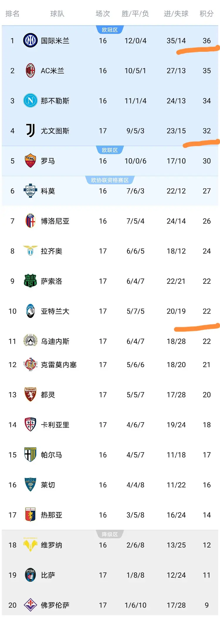 意甲最新积分榜情况:可以看到AC米兰、那不勒斯、国际米兰本轮先后赢球之后,积分榜前三没有变化,只是尤文图斯本轮赢球之后,暂时反超了罗马升至第4。可以看到目前意甲争冠集团汇集了5大劲旅,意甲的争冠大戏还是非常精彩的,不像德甲一家独大早已经没有了悬念。