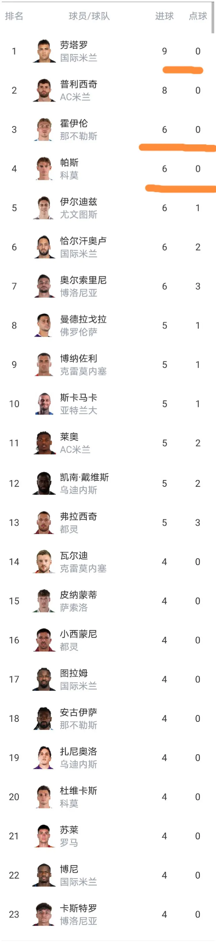 意甲射手榜前23的排名情况:本轮劳塔罗打入一球之后,以9球领跑射手榜,本轮打入一球之后,普利西奇来到了射手榜第二的位置,而霍伊伦本轮打入2球之后,来到了射手榜的第三位,不知道此时此刻曼联会不会后悔放走霍伊伦?