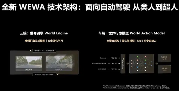 而对应部署在车端的世界行为模型 (WA),依托车载传感器的全模态感知,通过MoE多专家架构,针对不同路况精准、快速地调用最优决策模型,最终实现丝滑流畅的驾驶体验。