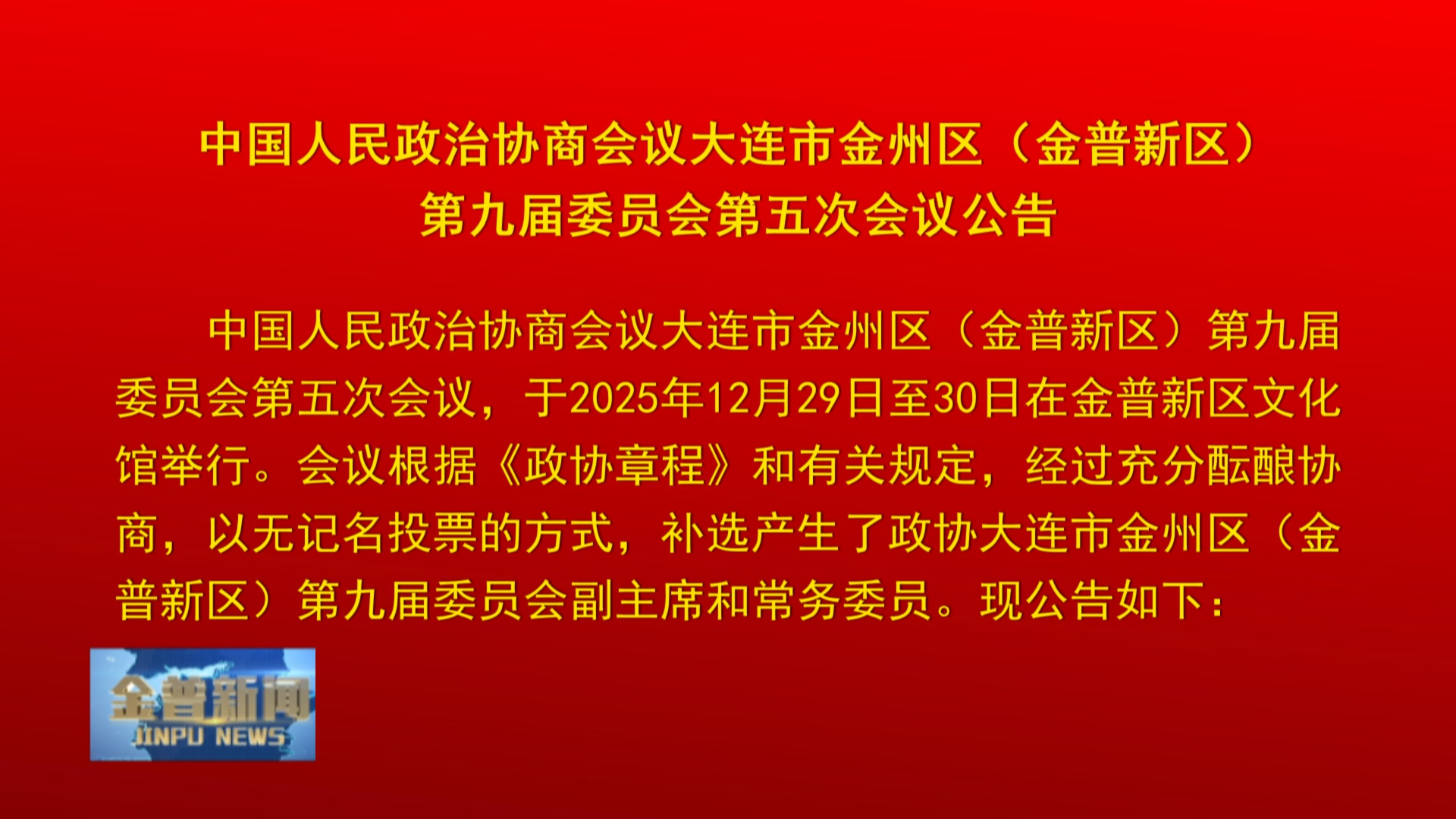 下面播发,中国人民政治协商会议大连市金州区(金普新区)第九届委员会第五次会议公告