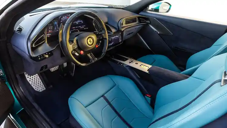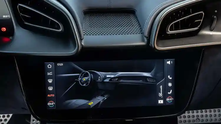 是的,这里迎接你的是一个全新的世界:方向盘上的触控按钮被真正的物理按钮取代,尤其是那个“启动”按钮,在Roma中原本被设计成位于法拉利标志下方的触控面板。现在,它显眼得不容错过,粗大而鲜红,赫然出现在左侧方向盘辐条上。“Premimi”,它似乎在对你说,意大利语意思是“按我”。